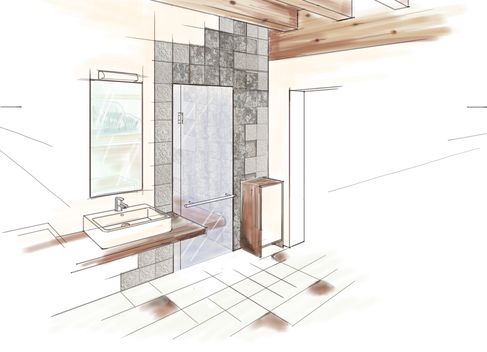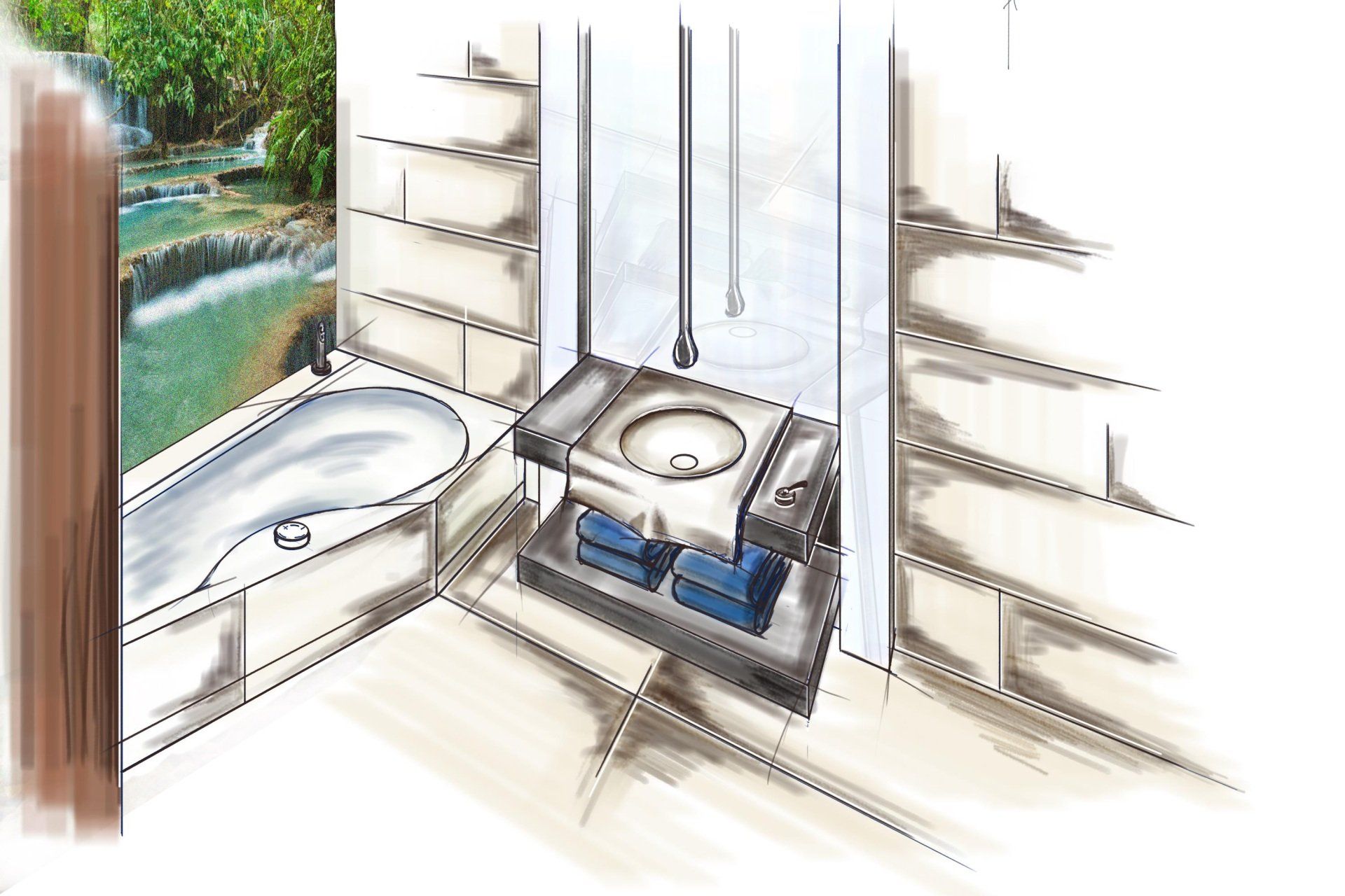- Handwerksraffinesse bei der fugenlosen Boden- Wandbeschichtung mit nahtlosem Übergang zu den Fliesen