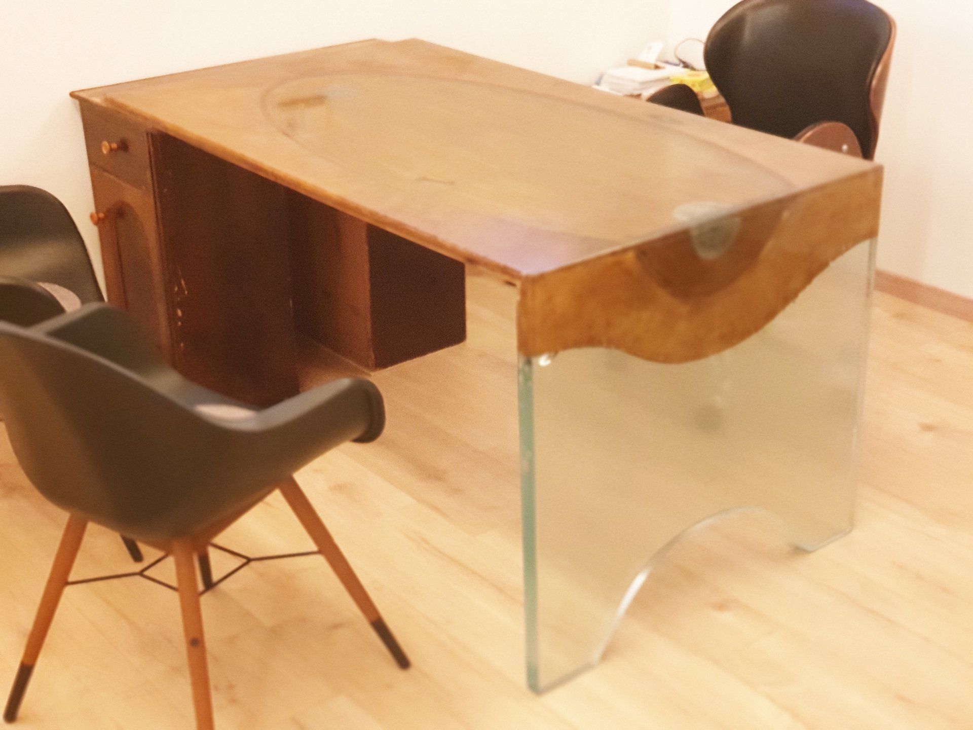 - individueller Schreibtisch aus antiker Kastentüre und Nachtkästchen
