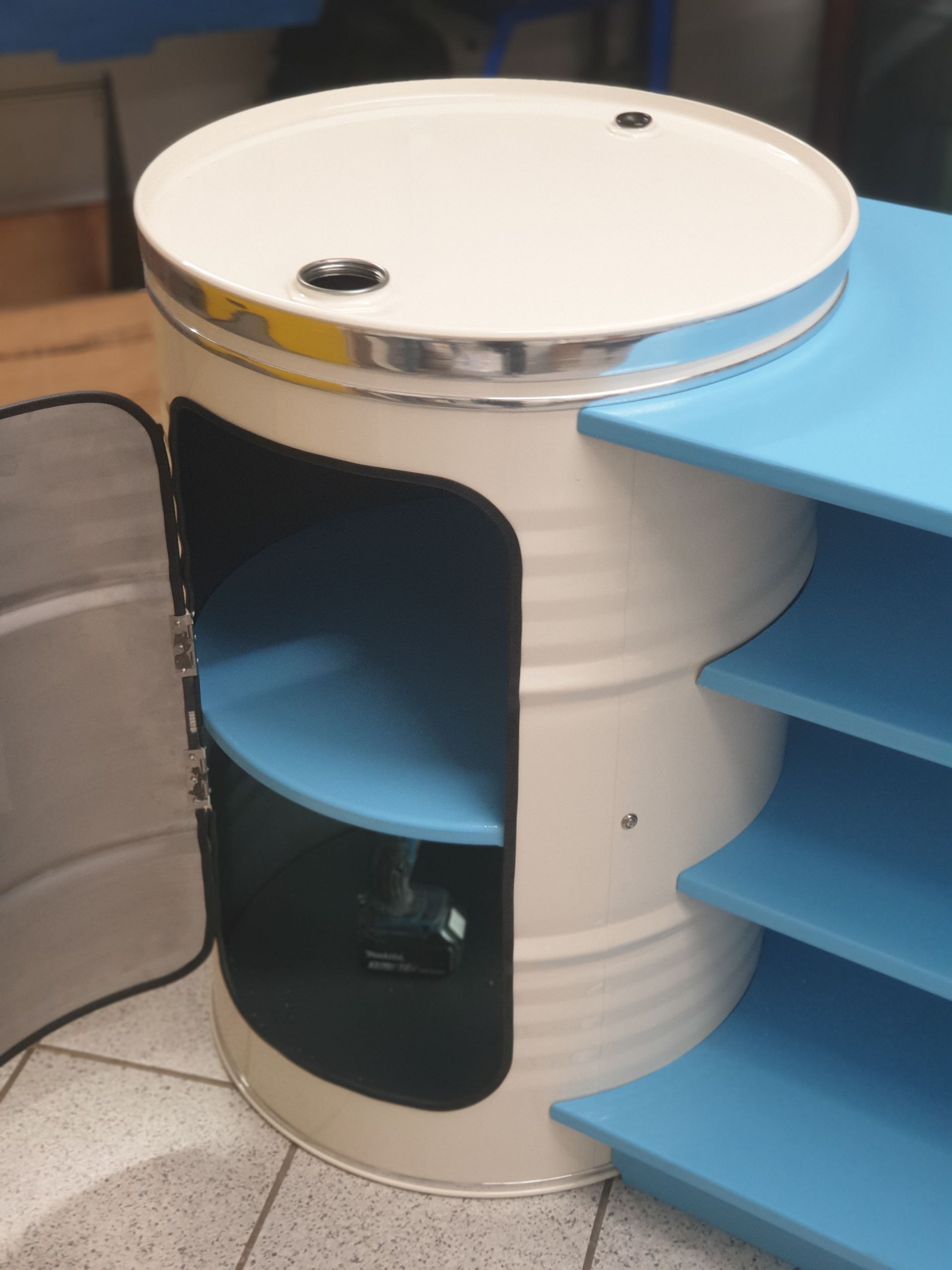 - Möbeldesign und -bau aus 200l Ölfässern mit innenliegenden Fachböden inkl. Tür.