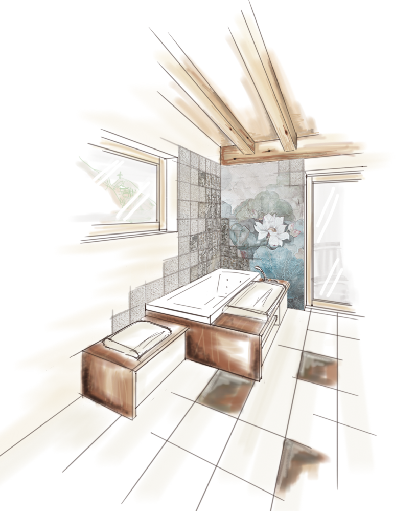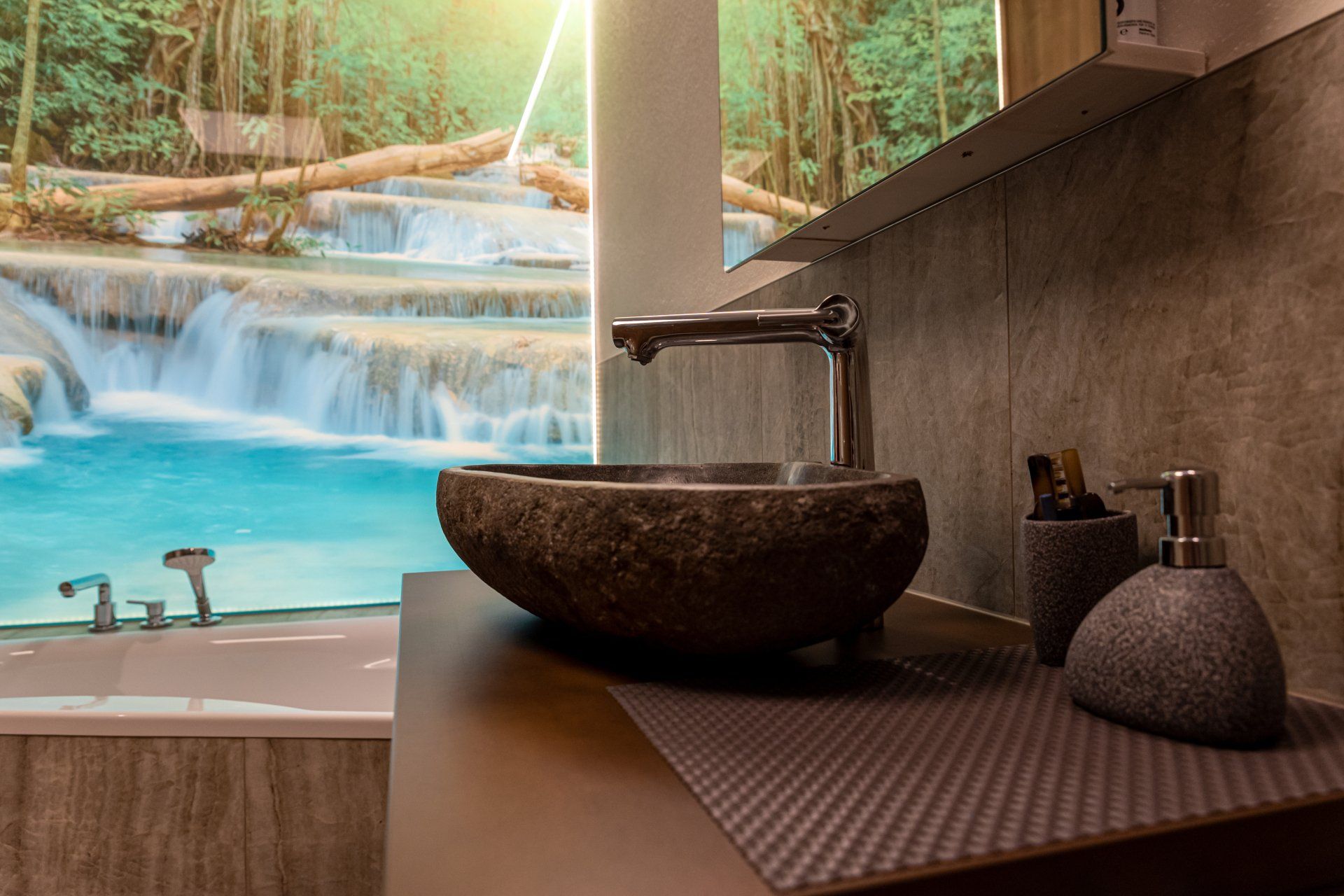 - Stimmungsvolle Wandgestaltung: Kombination aus freier Wandfläche, Fliesenkonzept und Spezial-Tapete für Nassräume im Wunschdesign der Kunden