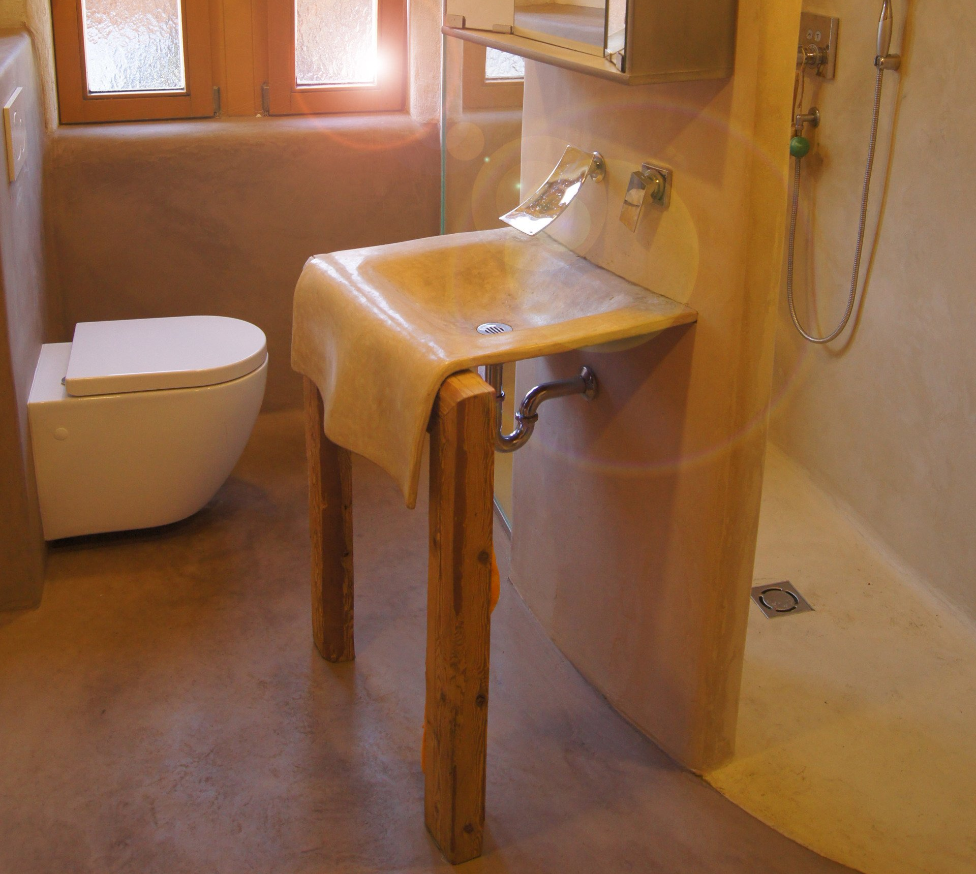 Bei der Altbausanierung wurden Bad, WC und Vorraum in ein großzügiges Badezimmer verwandelt. Der fliesenlose Raum ist in Boden- und Wandgestaltung mit Kalkputz verarbeitet. Abgerundete Kanten und ein gebogenes Mittelelement schaffen sanften Formen. Ein weiches, gemütliches Raumgefühl zum „rund“um wohlfühlen:
